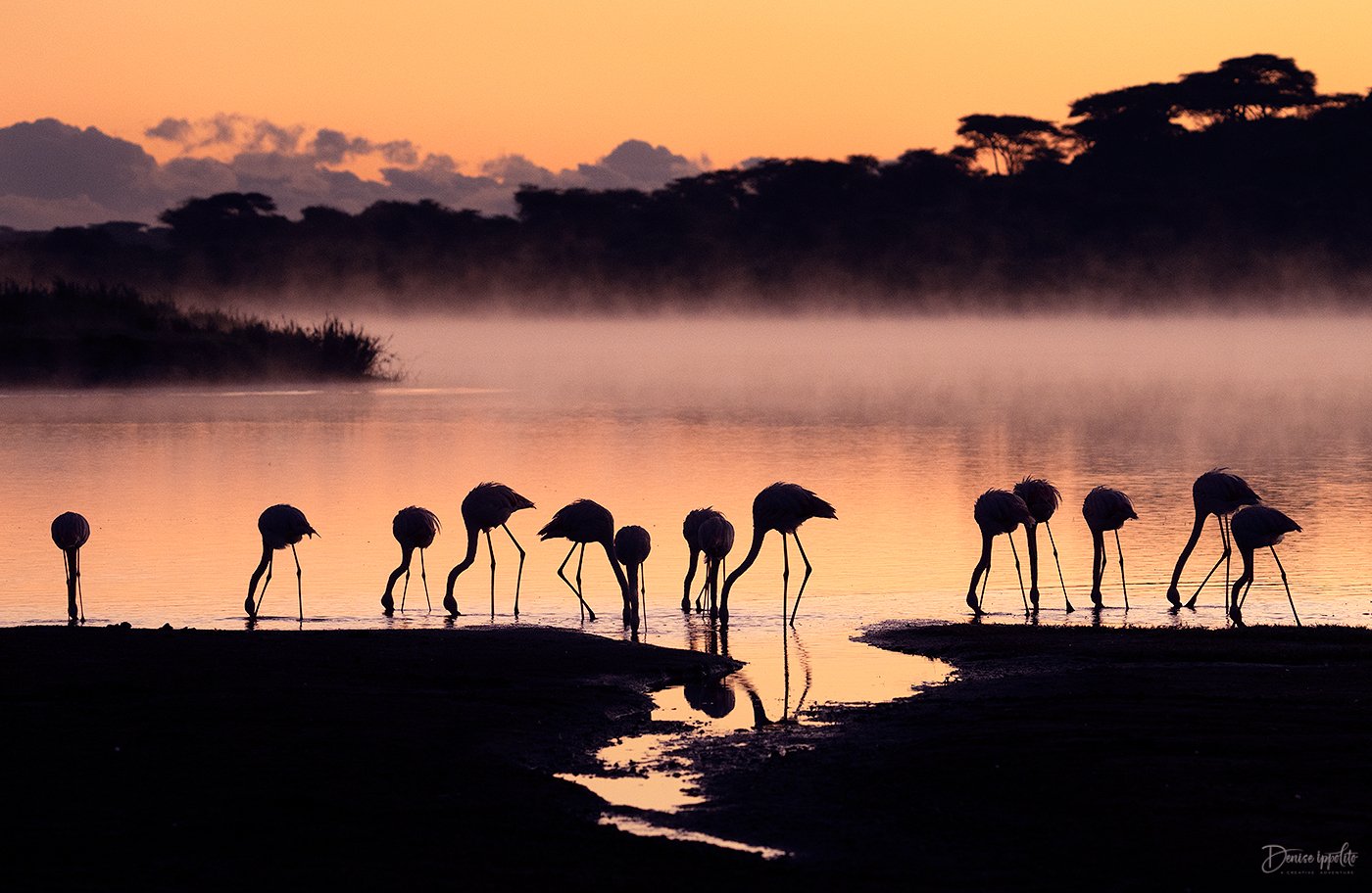 But my favorite photo session in Ndutu was on our last morning. We had early morning mist on the lake with plenty of flamingos. And if that wasn’t great enough, we had several hyenas in the water fighting over a wildebeest head and rib cage!