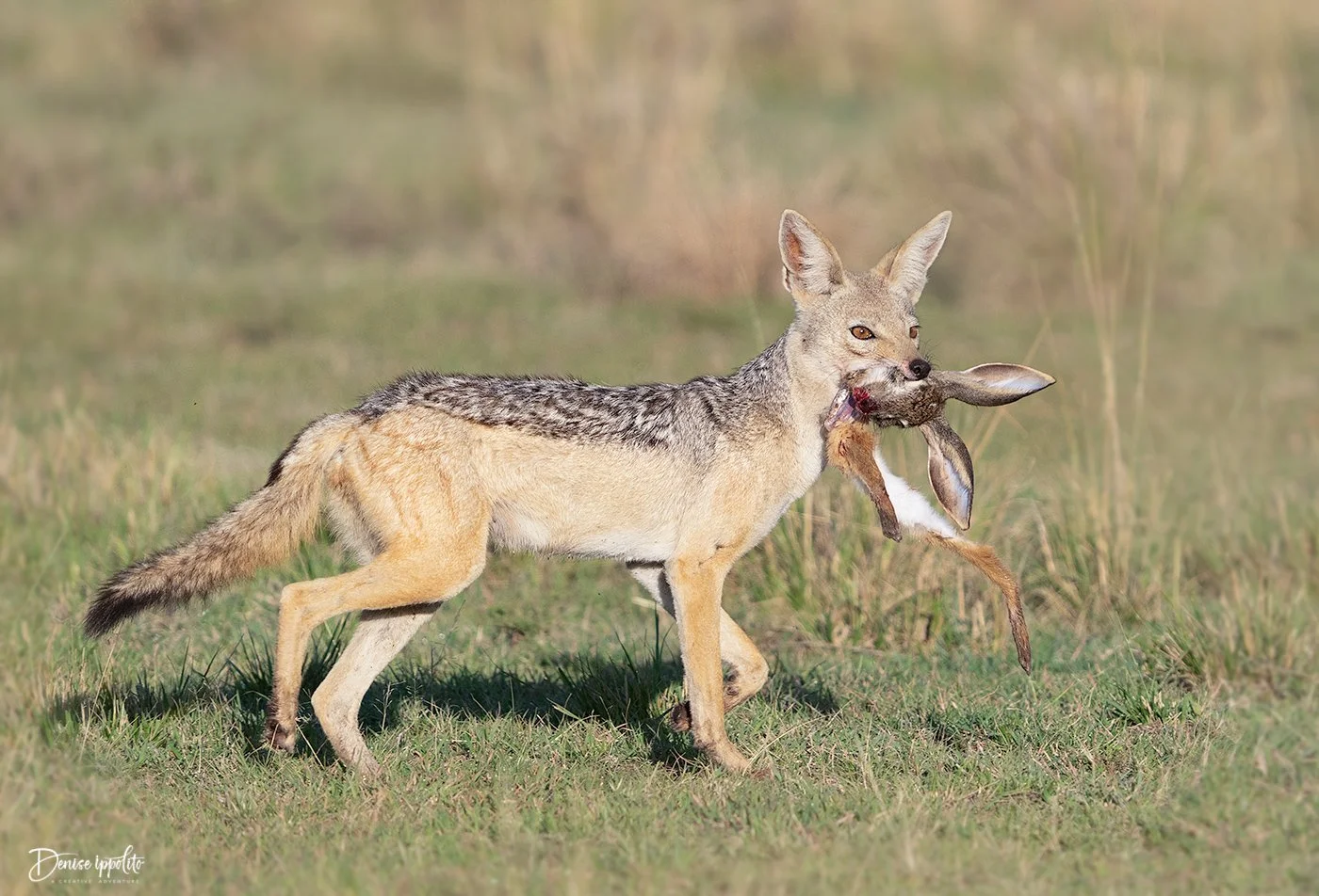 Two jackals have a tug of war over a rabbit kill. They each got one half in the end.