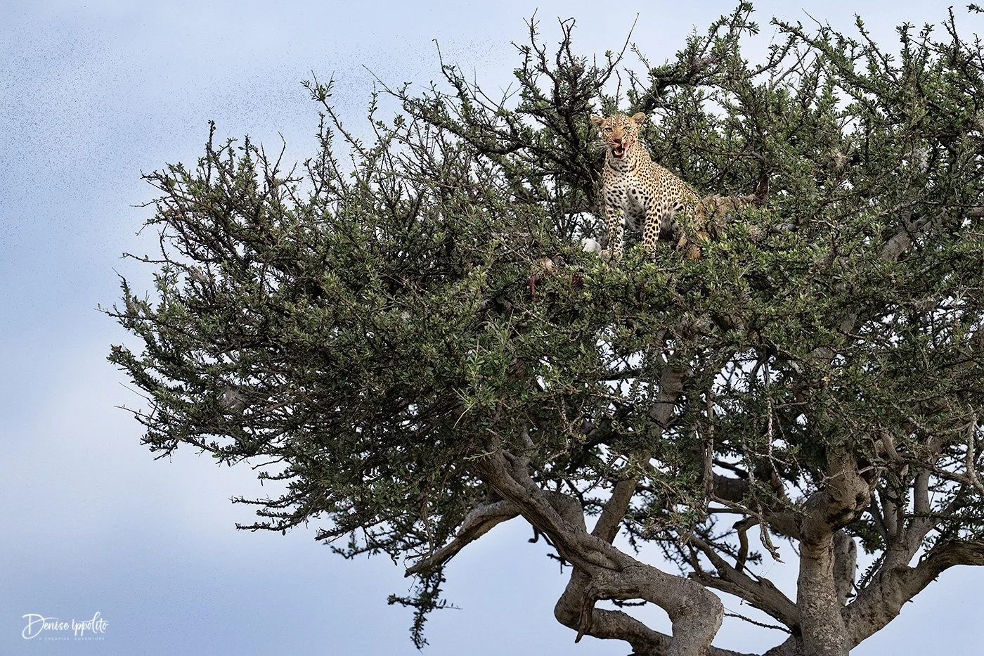 Our next morning started off slow with just a single cheetah sighting and some lion cubs <wink> but the afternoon picked up with an epic sighting of a leopard (named Faulu) that not only climbed a tree to reunite with her two different kills (gazelle and a jackal). But word on the savannah is that the jackal tried to get too close to the freshly killed gazelle, so the leopard caught it and carried up the tree too. The poor jackal’s mate combed the area looking for him not having a clue it was just up the tree.