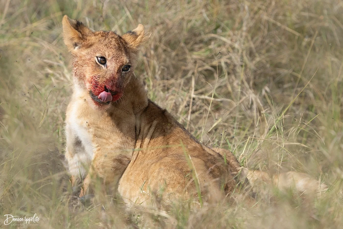 Later, after a short rest we photographed some more of the Topi pride cubs. They found a dead (probably died of old age) buffalo, the cubs were walking headfirst into the back end of the beast. With bloody faces they sure were cute. I’m glad they were able to feast, and the meat did not go to the hyenas. After our fill of blood and guts we went back to check on the cheetahs, but nothing was happening, so we drove off. I hope to check on them again!